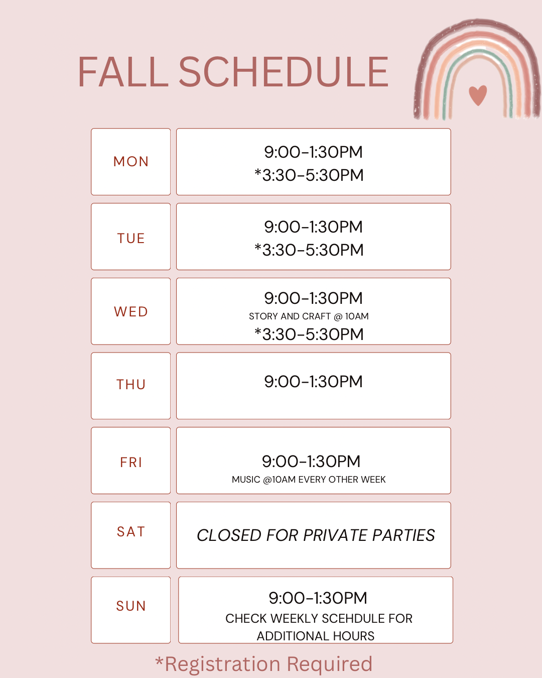 Schedule and hours are subject to change. Please check special events to see all upcoming pop up classes